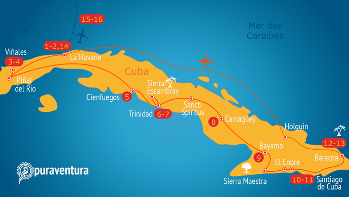 Cette fois-ci nous ne partons que tous les deux, nous ne maitrisons pas l'espagnol, le circuit que nous voulons faire est long. Nous choisissons donc la facilité en rejoignant un petit groupe de voyageurs avec l'agence Puraventura. https://www.puraventura.fr/circuit/cuba/xcub/itineraire